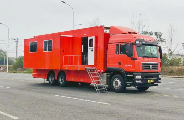 我公司生產(chǎn)的通信指揮車基于汕德卡ZZ5266XXYN504GF1K型廂式運輸底盤改裝,該底盤變速箱為手動變速箱,最高車速89km/h,發(fā)動機型號為MC07H.35-60,發(fā)動機排量:7360ml,排放國Ⅵ標準。消防通信指揮車以汕德卡ZZ5266XXYN504GF1K型廂式運輸底盤作為改裝平臺,保證工作人員擁有寬敞舒適的工作環(huán)境,并且為系統(tǒng)的運行和維護提供符合技術(shù)要求的環(huán)境條件。在保持整車優(yōu)良性能的前提下對車輛進行改裝而成,實現(xiàn)符合用戶使用要求的工作環(huán)境、使用功能而量身定制的特種專用車輛。消防通信指揮車具備通信組網(wǎng)功能和指揮通信與情報信息采集功能。通過高清晰、低照度車載云臺攝像機,可實現(xiàn)全天候、多方位、大范圍的現(xiàn)場監(jiān)控功能。通過車載硬盤錄像機,可以對現(xiàn)場的情況進行適時錄像、錄音記錄,以便日后進行調(diào)查,并可通過USB接口及數(shù)據(jù)端口與其他存儲設(shè)備相連接,進行現(xiàn)場刻錄,便于錄像資料的及時、有效保存。車載液晶電視可集中顯示系統(tǒng)采集到的信息,便于領(lǐng)導實時掌握事發(fā)現(xiàn)場的各種情況,可以及時指揮調(diào)度,正確決策。